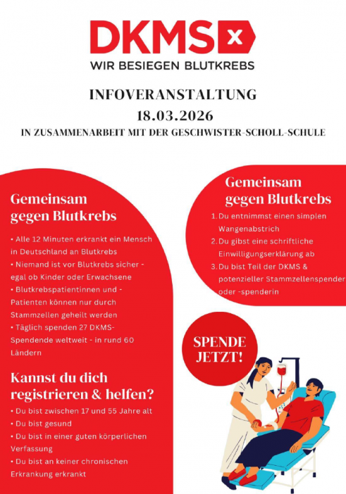Verantwortung übernehmen, Engagement zeigen und gemeinsam etwas bewegen – genau das macht die 11IK2 in Kooperation mit der Geschwister-Scholl-Schule möglich. Im Rahmen eines Projekts haben wir eine Infoveranstaltung zur DKMS organisiert, die am 18.03.2026 an der Geschwister-Scholl-Schule stattfindet. Ziel ist es, über Blutkrebs aufzuklären und möglichst viele Menschen zur Registrierung für eine Stammzellspende zu motivieren.